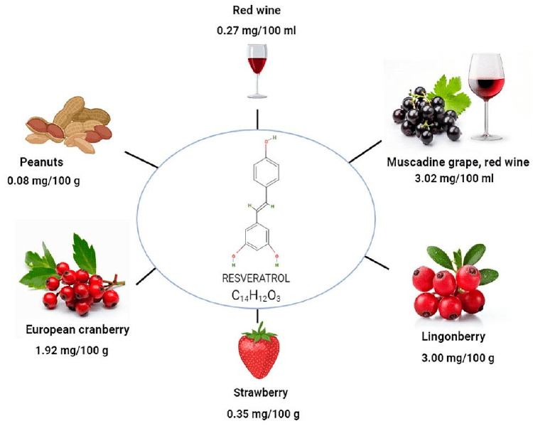 เรสเวอราทรอลเป็นโพลีฟีนอลธรรมชาติที่พบในเปลือกองุ่น บลูเบอร์รี่ และผลไม้อื่นๆ มีการศึกษาอย่างกว้างขวางถึงศักยภาพในการต้านอนุมูลอิสระ เสริมสร้างการป้องกันเซลล์จากความเครียดออกซิเดชัน และส่งเสริมสุขภาพหัวใจและหลอดเลือด